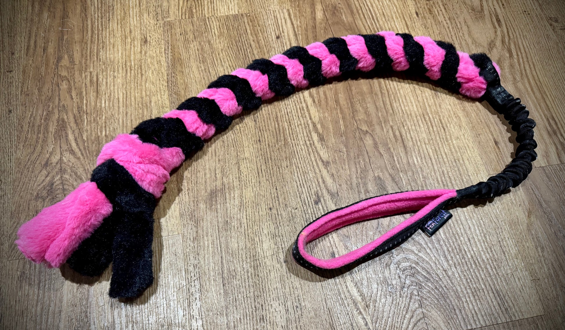 A short and super soft fluffy fabric, braided into a strong twister braid on a double bungee comfort handle.