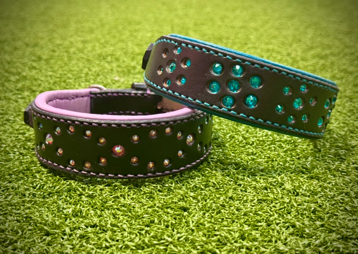 These absolutely stunning black leather collars lined with quality soft napa leather are sure to impress, premium quality stones for the extra Bling